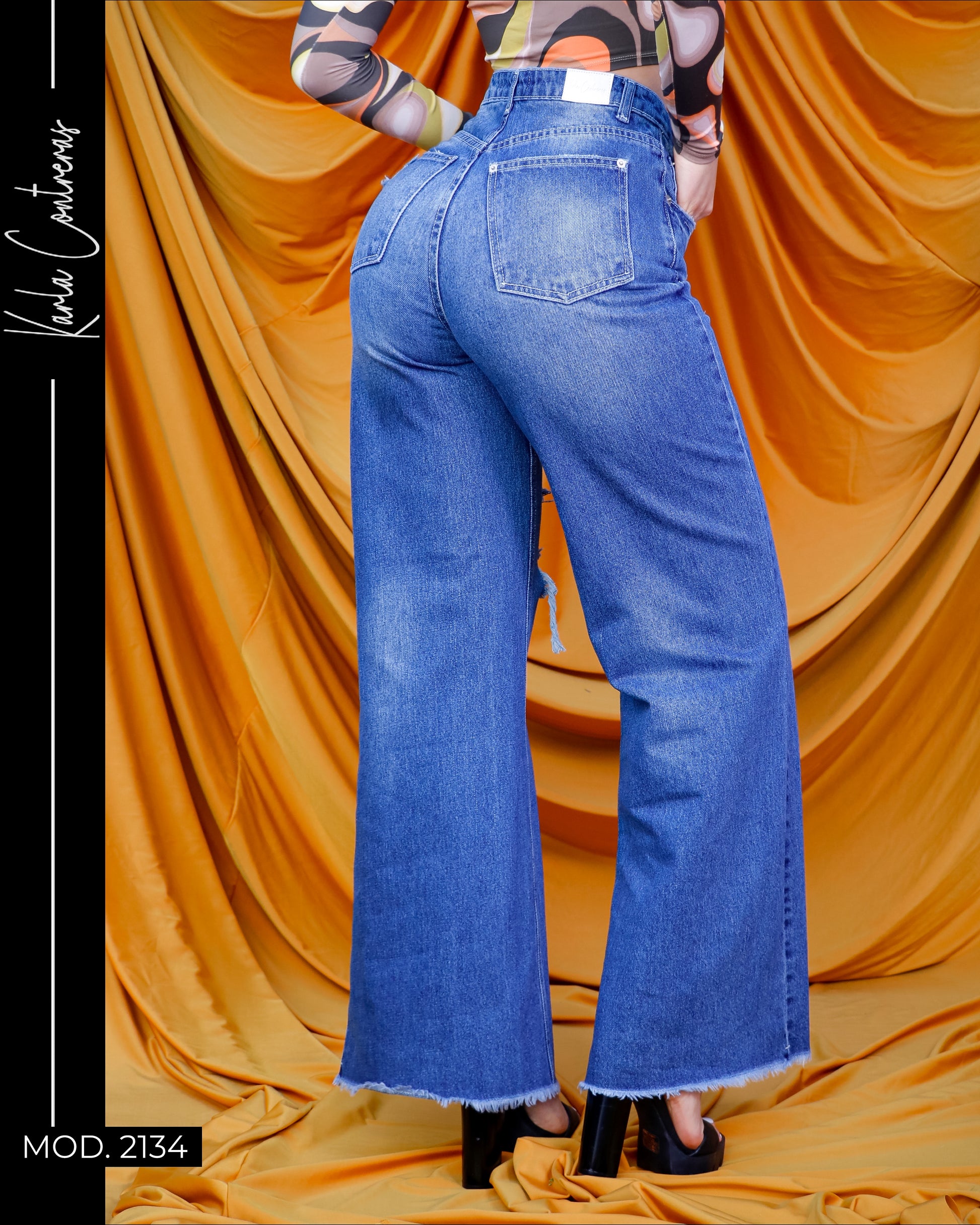 Jeans wide leg tipo MomFit, con deseño rasgado.
